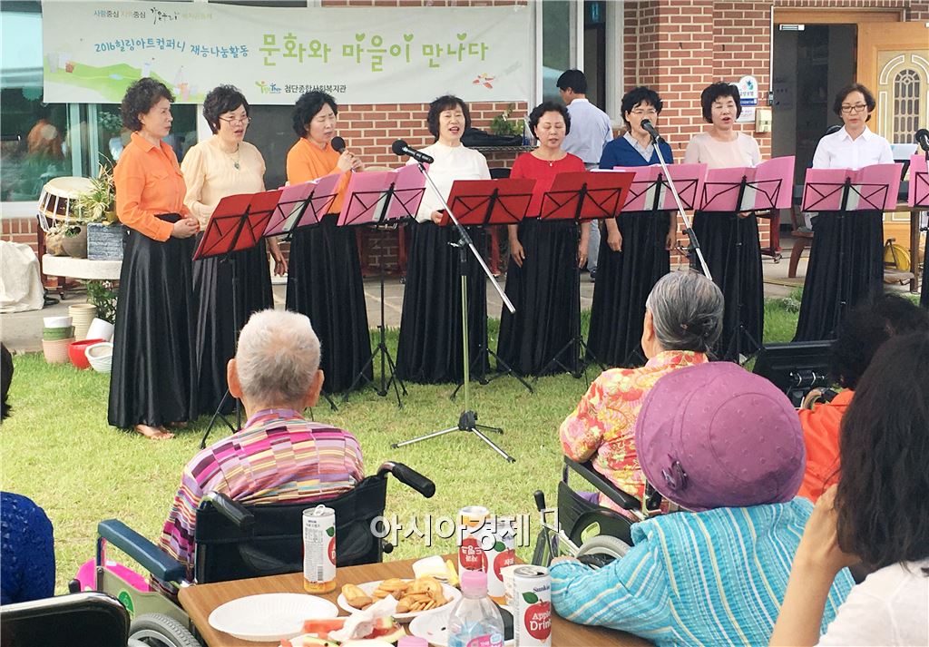 [아시아경제 노해섭 기자]광주 광산구 비아동에 있는 뜰안애노인요양시설(시설장 김민화)은 시설 어르신과 마을 주민 70여 명이 참여한 가운데 지난 26일 문화나눔행사를 열었다. 이날 행사에는 첨단복지관 이용 주민들이 결성한 동아리 ‘송하울림’과 ‘높은음자리’가 재능기부 공연으로 힘을 보탰다. 김민화 시설장은 “요양원 앞마당이 넓고 경관이 좋아 7년 전부터 마을 주민과 함께 문화나눔행사를 진행하고 있다”며 “앞으로도 공간을 공유해 주민과 만남의 장소로 만들어가겠다”고 밝혔다. 노해섭 기자 nogary@<ⓒ세계를 보는 창 경제를 보는 눈, 아시아경제(www.asiae.co.kr) 무단전재 배포금지>