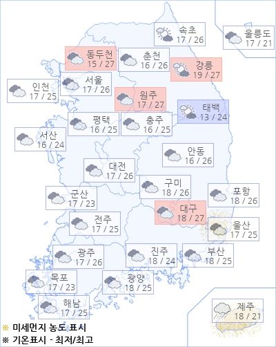 현재 기온이 가장 낮은 곳은 태백으로 영상 13도이며, 울릉도는 영상 21도로 가장 높은 기온을 기록하고 있고, 아침 최저기온은 영상 13도에서 영상 19도, 낮 최고기온은 영상 21도에서 영상 27도가 되겠습니다.미세먼지 농도: 오전 울산·제주 지방은 ‘나쁨’ 입니다.※ 미세먼지 자료는 인증되지 않은 실시간 자료이므로 오차가 발생할수 있음.아경봇 기자 r2@asiae.co.kr<ⓒ세계를 보는 창 경제를 보는 눈, 아시아경제(www.asiae.co.kr) 무단전재 배포금지>