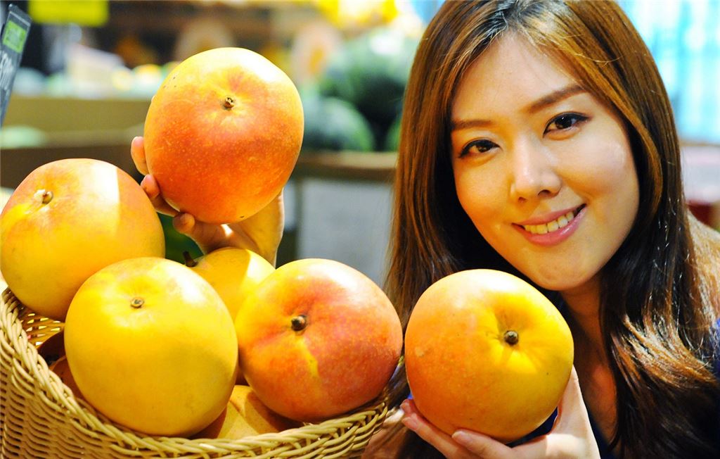 29일 홈플러스 강서점에서 모델이 필리핀산 애플망고를 선보이고 있다. 이 애플망고는 현지에서도 소량 생산되는 품종으로, 천연 자연환경에서 자라 야생의 거친 표면을 갖고 있으며, 황금빛의 진한 과육과 깊은 풍미를 자랑한다. 31일까지 전국 140개 점포(합정점 제외)에서 구매할 수 있으며, 가격은 개당 9990원이다.<br /> <br />