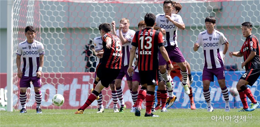[아시아경제 김현민 기자]프로축구 FC서울과 전남 드래곤즈의 K리그 클래식 경기가 29일 서울월드컵경기장에서 열렸다. 서울 오스마르가 전반 1-1 동점 프리킥 골을 성공시키고 있다.김현민 기자 kimhyun81@asiae.co.kr<ⓒ세계를 보는 창 경제를 보는 눈, 아시아경제(www.asiae.co.kr) 무단전재 배포금지>