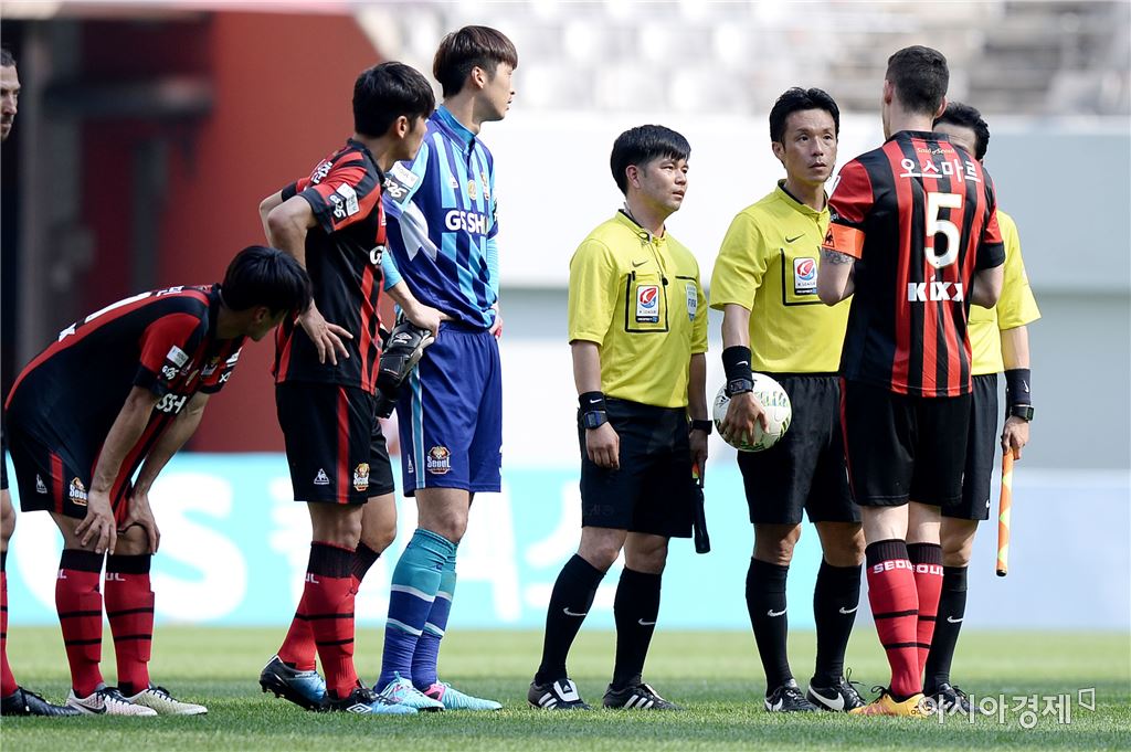 [아시아경제 김현민 기자]프로축구 FC서울과 전남 드래곤즈의 K리그 클래식 경기가 29일 서울월드컵경기장에서 열렸다. 서울 주장 오스마르가 경기 후 심판들에게 어필하고 있다.김현민 기자 kimhyun81@asiae.co.kr<ⓒ세계를 보는 창 경제를 보는 눈, 아시아경제(www.asiae.co.kr) 무단전재 배포금지>