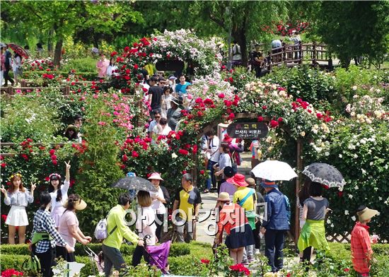 "누적 관람객 23만 3천 231명, 1일 평균 관광객 2만 명 넘어""지역상가도 밀려드는 방문객에 들썩들썩" [아시아경제 노해섭 기자]‘제6회 곡성 세계장미축제’가 흥행 대박을 터뜨렸다. 지난 20일 개막 후 10일간 곡성 장미축제를 다녀간 관람객은 총 23만 명을 돌파하며 역대 최대의 흥행을 기록했다. 더욱이 장미축제를 관람하러 온 입장객들로 곡성 전역이 인산인해를 이뤄 이들이 다녀간 음식점, 숙박시설, 주유소, 마트 등 지역상가도 함께 큰 매출을 거둔 것으로 알려졌다. 올해 관광객 23만 명 돌파 성공은 지난해 축제 관광객 22만여 명보다 3% 이상 많은 기록이다. 평일 관람객은 지난해보다 평균 5천여 명이 더 다녀가 지난해 주말에만 집중됐던 입장객이 평일에도 많이 찾은 것으로 나타났다. 여기에 지난해와 비교할 때 축제가 시작되기 이전에도 많은 관람객들이 미리 다녀간 것으로 확인돼 장미축제의 인기를 실감케 하고 있다.지난해는 주말과 석가탄신일 연휴가 연결된 황금연휴와 26도씨 정도의 선선한 날씨로 최적의 관람여건을 갖춰 22만 명이 곡성을 찾았었다.