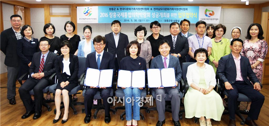 장흥군(군수 김성)은 30일 군청 상황실에서 한국 다문화가족지원센터협의회(회장 신숙자), 전남 다문화가족지원센터협의회(회장 고봉주)와 2016장흥국제통합의학박람회 성공개최를 위한 업무협약을 맺었다.