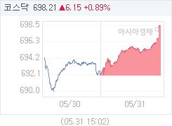 2016년 05월 31일 코스닥 지수는 6.39p (0.92%) 상승한 698.45로 마감했습니다.금일 (2시40분 기준) 코스닥 주요 상승 종목은 코디엠,코디에스,나노이며, 코스닥 주요 하락 종목은 씨엔플러스,금성테크,하림입니다.아경봇 기자 r2@asiae.co.kr<ⓒ세계를 보는 창 경제를 보는 눈, 아시아경제(www.asiae.co.kr) 무단전재 배포금지>