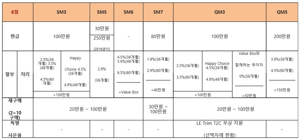[아시아경제 송화정 기자]르노삼성자동차는 개별소비세 인하 특혜 마지막 달인 6월을 맞이해 밸류박스와 함께하는 QM3 무이자 할부를 비롯해 각 모델 별로 혜택이 더욱 강화된 현금 할인 및 할부 조건을 선보인다.6월에 QM3를 구매하는 고객은 밸류박스와 함께하는 36개월 무이자 할부를 선택할 수 있다. 이 경우 추가로 50만원 할인 혜택을 제공 받을 수 있다. 또한 2.5% 초저리부터 선택 가능한 할부 선택 시 100만원의 할인 혜택이 제공된다. QM3 LE 모델을 구매하는 모든 고객은 본인 선택에 따라 신개념 태블릿 내비게이션인 T2C를 무상으로 장착할 수 있다.밸류박스는 해피케어 보증연장 서비스, 신차 교환 보장 프로그램, 스마트 운전자보험으로 구성된 신개념 자동차 패키지 할부 상품이다. SM6는 밸류박스와 함께하는 저리 할부를 이용할 수 있다. 이 상품을 이용하면 기간에 따라 4.5%(36개월), 5.9%(48개월), 6.5%(60개월)의 저리로 SM6를 구매할 수 있다. 이외에 다른 모델에도 풍성한 혜택의 현금 할인과 할부 조건이 제공된다. 현금 구매 시 QM5는 200만원, SM3는 100만원 할인된 가격으로 구매 가능하며 SM7과 SM5는 각각 80만원, 30만원의 할인 혜택이 주어진다. 특히 2016년식 SM5의 경우 최대 250만원의 현금 할인 혜택이 제공된다. 할부 상품은 초저리 금리와 함께 QM5 150만원, SM3 100만원, SM7 40만원의 할인을 제공한다. SM3와 QM3는 월 납입금을 자유롭게 설계할 수 있는 신개념 할부인 해피초이스 프로그램도 이용 가능하며 4.5%(36개월)와 4.9%(48개월)의 두 가지 상품 중 선택할 수 있다.르노삼성의 6월 판매 조건에 대한 보다 자세한 내용은 가까운 영업지점이나 르노삼성 고객센터(080-300-3000)를 통해 문의하면 된다. 송화정 기자 pancake@asiae.co.kr<ⓒ세계를 보는 창 경제를 보는 눈, 아시아경제(www.asiae.co.kr) 무단전재 배포금지>