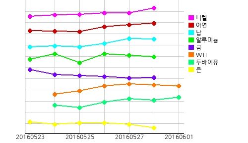 국제 원자재 시장에서 WTI(서부텍사스산원유)의 현물시세가 전일 대비 0.23 달러 떨어진 배럴당 49.1 달러를 기록했고, 두바이유 현물시세는 전일 대비 0.36 달러 오른 배럴당 45.9 달러를 기록했다.금 현물시세는 전일과 동일한 온스당 1215.43 달러를 기록했고, 반면 은 현물시세는 전일 대비 0.24 달러 떨어진 온스당 15.99 달러를 기록했다.주요광물시세는 니켈이 전일 대비 톤당 85.5 달러 올라 8459 달러를 기록했고 아연이 상승세를 보이는 반면, 주석이 전일 대비 톤당 38.5 달러 떨어져 16200 달러를 기록했고 알루미늄, 납이 하향세를 보였다.환율