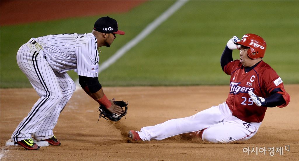 [잠실=아시아경제 김현민 기자] 프로야구 KIA 타이거즈와 LG 트윈스의 2016 KBO리그 경기가 1일 잠실구장에서 열렸다. 8회초 1사 1루에서 KIA 이범호가 추가 1타점 2루타를 치고 홈으로 송구된 사이 3루로 진루하려다 아웃되고 있다. LG 3루수는 히메네스.김현민 기자 kimhyun81@asiae.co.kr<ⓒ세계를 보는 창 경제를 보는 눈, 아시아경제(www.asiae.co.kr) 무단전재 배포금지>