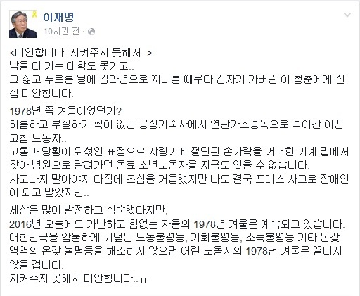 [아시아경제 이종윤 인턴기자] 이재명 성남시장이 지난달 28일 구의역 승강장 스크린도어 수리 중 사망한 김모씨(20)에 대해 추모의 글을 남겼다.이 시장은 1일 자신의 페이스북에 "미안합니다. 지켜주지 못해서"라는 제목의 글을 실었다.이어 "남들 다 가는 대학도 못 가고 젊고 푸르른 날에 컵라면으로 끼니를 때우다 갑자기 가버린 이 청춘에게 진심 미안합니다"라고 말했다.그러면서 이 시장은 "1978년쯤 겨울 허름하고 부실한 공장기숙사에서 연탄중독으로 죽어간 어떤 고참 노동자, 샤링기에 절단된 손가락을 거대한 기계 밑에서 찾아 병원으로 달려가던 동료 소년 노동자를 지금도 잊을 수 없다"며 과거 자신이 겪었던 노동자 시절을 회상했다. 이 시장은 초등학교를 졸업하고 프레스 공장에 다니다가 기계에 왼팔이 끼는 사고를 입고 '6급 장애인' 판정을 받은 바 있다. 이 시장은 끝으로 2016년 오늘에도 가난하고 힘없는 자들의 1978년 겨울은 계속된다"며 "대한민국을 암울하게 뒤덮은 노동불평등, 기회불평등, 소득불평등 기타 온갖 불평등을 해소하지 않으면 어린 노동자의 1978년 겨울은 끝나지 않을 것"이라고 시대의 화두를 던졌다. 한편 서울메트로는 지난해 8월 강남역 승강장 스크린도어 정비 사고와 구의역 정비 사고까지 일어나자 재발 방지 대책으로 승강장 안전문 고장과 오류 등을 실시간 모니터링하고 대응 가능한 시스템을 도입하기로 했다. 또 유지 보수 직원이 정비를 할 때 공사 직원이 반드시 입회해 2인1조 작업 이행여부와 안전 수칙 등 준수 사항도 확인할 방침이다.이종윤 인턴기자 yagubat@asiae.co.kr<ⓒ세계를 보는 창 경제를 보는 눈, 아시아경제(www.asiae.co.kr) 무단전재 배포금지>