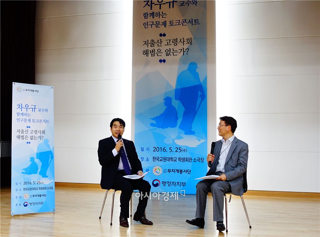 지난달 25일 지역발전정책연구원(원장 박대우/사진 왼쪽)이 주관한 ‘저출산 고령사회 해법은 없는가’ 토크콘서트가 한국교원대학교 학생회관 소극장에서 차우규 교수(사진 오른쪽)가 패널로 참석해 함께 고민하고 해법을 모색하는 시간을 가졌다. 사진=지역발전정책연구원