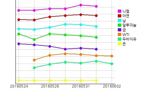 국제 원자재 시장에서 WTI(서부텍사스산원유)의 현물시세가 전일 대비 0.09 달러 떨어진 배럴당 49.01 달러를 기록했고, 두바이유 현물시세는 전일 대비 0.46 달러 떨어진 배럴당 45.44 달러를 기록했다.금 현물시세는 전일 대비 2.48 달러 떨어진 온스당 1212.95 달러를 기록했고, 은 현물시세도 전일 대비 0.03 달러 떨어진 온스당 15.96 달러를 기록했다.주요광물시세는 주석이 전일 대비 톤당 298.5 달러 떨어져 15901.5 달러를 기록했고 니켈, 아연, 납, 알루미늄 모두 하향세를 보였다.환율