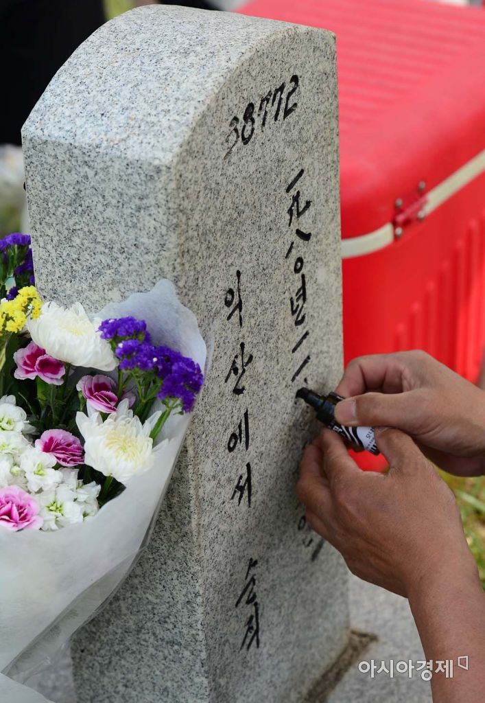 [아시아경제 백소아 기자] 제61회 현충일인 6일 서울 동작구 국립현충원에서 참배객이 동생의 묘비에 닳아 없어진 글씨를 매직으로 메우고 있다.백소아 기자 sharp2046@asiae.co.kr<ⓒ세계를 보는 창 경제를 보는 눈, 아시아경제(www.asiae.co.kr) 무단전재 배포금지>