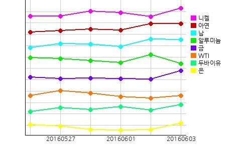 국제 원자재 시장에서 WTI(서부텍사스산원유)의 현물시세가 전일 대비 0.16 달러 오른 배럴당 49.17 달러를 기록했고, 두바이유 현물시세는 전일 대비 0.73 달러 오른 배럴당 46.17 달러를 기록했다.금 현물시세는 전일 대비 33.41 달러 오른 온스당 1244.49 달러를 기록했고, 은 현물시세도 전일 대비 0.41 달러 오른 온스당 16.41 달러를 기록했다.주요광물시세는 주석이 전일 대비 톤당 312.5 달러 올라 16541.5 달러를 기록했고 니켈, 아연이 상승세를 보이는 반면, 알루미늄이 전일 대비 톤당 15.5 달러 떨어져 1542.65 달러를 기록했고 납이 하향세를 보였다.아경봇 기자 r2@asiae.co.kr<ⓒ세계를 보는 창 경제를 보는 눈, 아시아경제(www.asiae.co.kr) 무단전재 배포금지>