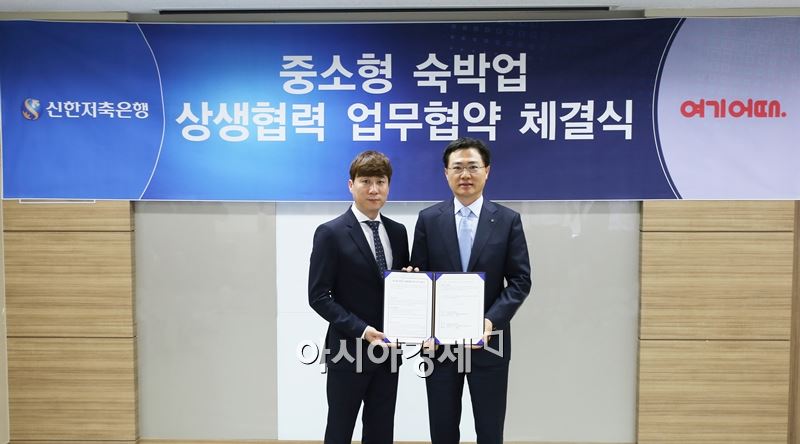 위드이노베이션이 신한저축은행과 ‘중소형 숙박업 상생협력 업무협약’을 체결했다고 7일 밝혔다. 왼쪽은 심명섭 위드이노베이션 대표, 오른쪽은 신한저축은행 김영표 대표.