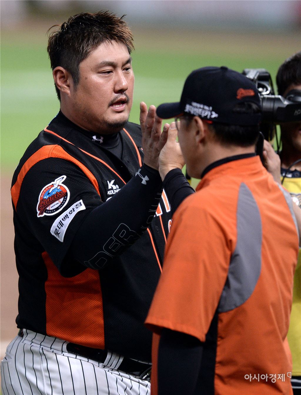 [문학=아시아경제 김현민 기자] 프로야구 롯데 자이언츠와 SK 와이번스의 2016 KBO리그 경기가 7일 인천 문학구장에서 열렸다. 롯데 최준석이 팀의 9-6 승리를 확정한 뒤 조원우 감독과 자축하고 있다. 김현민 기자 kimhyun81@asiae.co.kr<ⓒ세계를 보는 창 경제를 보는 눈, 아시아경제(www.asiae.co.kr) 무단전재 배포금지>