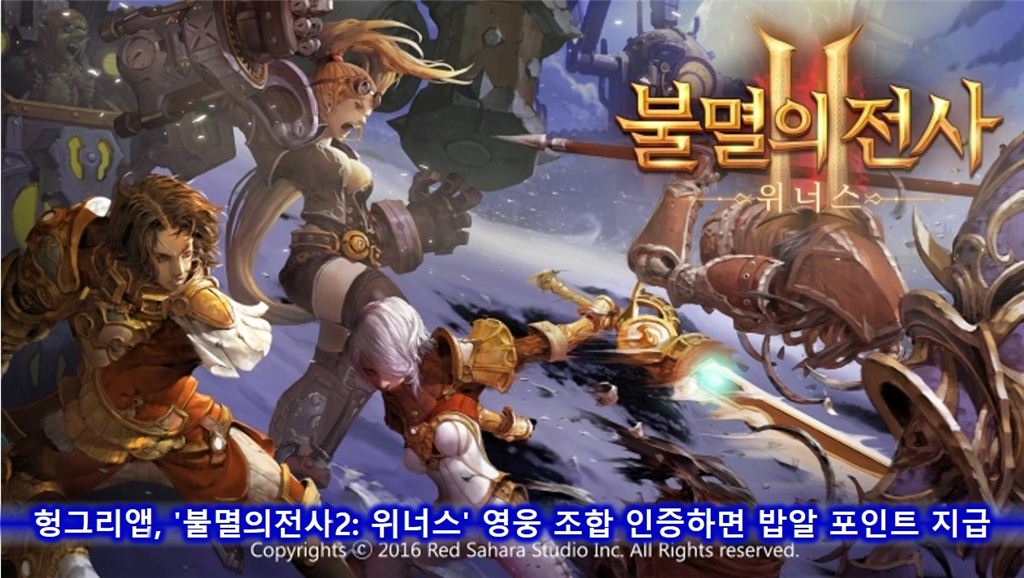 이번 미션은'영웅 조합 준비하기!'로 이벤트 기간 동안‘불멸의전사2 헝그리앱’에 영웅조합에서 재료영웅을 1개 이상 놓은 후 게시판에 인증하면 추첨을 통해 헝그리앱 내에서 현금처럼 사용할 수 있는 밥알 포인트를 지급한다. 본 이벤트는 6월 10일까지 진행되며 자세한 내용은 '헝그리앱 미션' 또는 '불멸의 전사2 헝그리앱' 미션 공지를 통해 확인할 수 있다.헝그리앱에서 진행하는 다양한 이벤트와 커뮤니티 활동을 통해 획득한 밥알 포인트는 ‘헝그리앱 헝앱샵’에서 ‘구글플레이 기프트 카드’, ‘게임 캐시’, ‘문화상품권’을 비롯해 각종 게임 아이템, 게이밍 키보드 및 마우스, 영화예매권, 외식 프랜차이즈 이용권 등, 게임 및 실생활에 필요한 유용한 상품들을 구매할 수 있다.온라인이슈팀 issue@asiae.co.kr<ⓒ세계를 보는 창 경제를 보는 눈, 아시아경제(www.asiae.co.kr) 무단전재 배포금지>