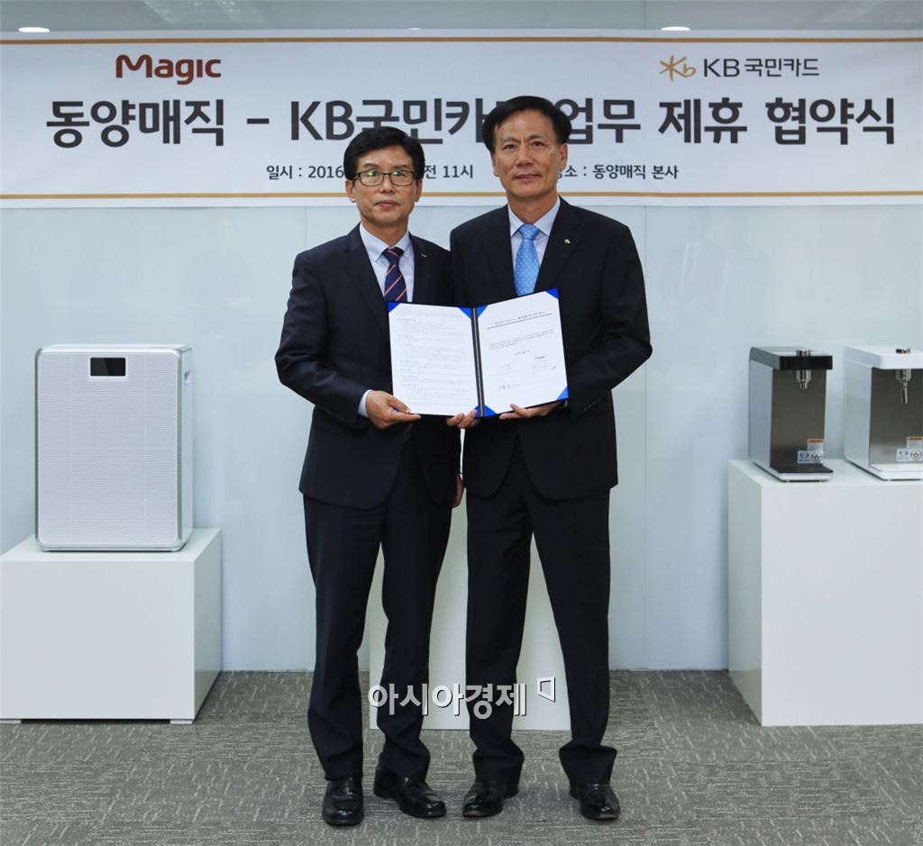 동양매직은 지난 7일 KB국민카드와 양해각서(MOU)를 체결하고 렌탈 요금 할인 혜택을 제공하는 ‘동양매직 KB국민카드’를 출시했다고 9일 밝혔다. 동양매직 렌탈사업본부장 김삼열 상무(좌)와 KB국민카드 개인영업본부 이몽호 상무가 MOU체결 후 기념사진을 촬영했다.
