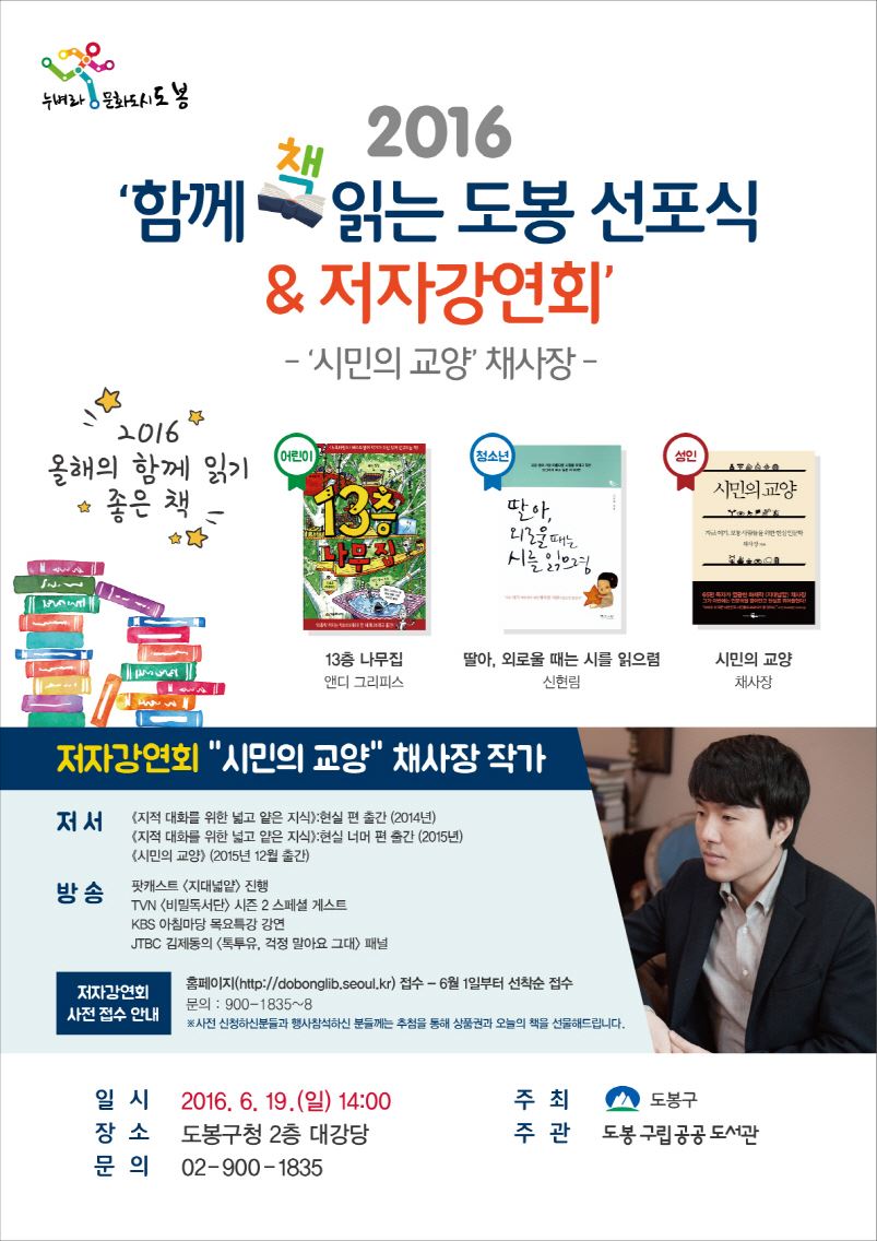 도봉구, 19일 구청 2층 대강당에서 ‘함께 책 읽는 도봉’ 선포식 및 저자강연회 개최...‘올해의 함께 읽기 좋은 책’ 3권 선정 및 작가 채사장의 저자강연회 진행