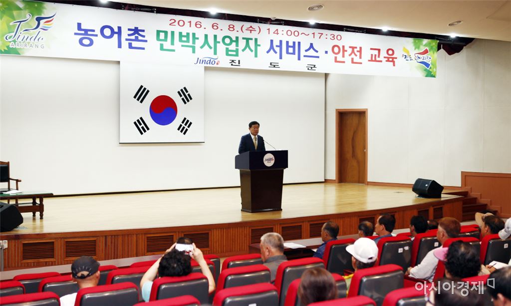 진도군이 농어촌 민박 이용객의 만족도를 높이기 위해 최근 진도군청 대회의실에서 민박사업자 122명을 대상으로 농어촌민박 서비스·안전 교육을 실시했다.<br />