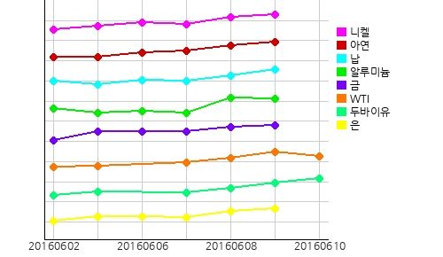 국제 원자재 시장에서 WTI(서부텍사스산원유)의 현물시세가 전일 대비 0.67 달러 떨어진 배럴당 50.56 달러를 기록했고, 두바이유 현물시세는 전일 대비 0.99 달러 오른 배럴당 48.98 달러를 기록했다.금 현물시세는 전일과 동일한 온스당 1269.82 달러를 기록했고, 은 현물시세도 전일 대비 0.23 달러 오른 온스당 17.28 달러를 기록했다.주요광물시세는 알루미늄이 전일 대비 톤당 4.5 달러 떨어져 1591.4 달러를 기록하는 반면, 주석이 전일 대비 톤당 137.5 달러 올라 17286.5 달러를 기록했고 니켈, 아연, 납 모두 상승세를 보였다.환율