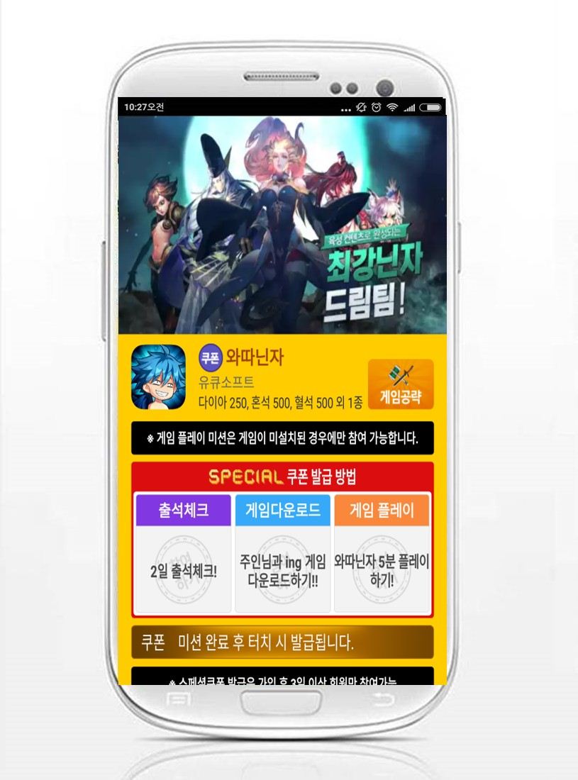 이번에 추가한 스페셜 쿠폰은 인생 역전 닌자 RPG ‘와따닌자’ 쿠폰으로 ‘2일 출석체크’, ‘게임 5분 플레이’와 ‘주인님과 ing게임 다운로드’ 세 가지 미션을 완료하면 다이아 250개, 혼석 500개, 혈석 500개, 스킨코인 500개 등 4만 원 상당의 혜택을 증정한다.유큐소프트에서 서비스하는 ‘와따닌자’는 매력 넘치는 45개의 캐릭터로 본인만의 닌자드림팀을 구성해 랭크전과 진영 길드전 등 다양한 전장을 즐기는 카드 수집형 RPG로 흙수저 닌자를 영웅으로 성장시키는 재미를 만끽할 수 있다.유쾌한 튜토리얼 영상과 알차게 구성된 콘텐츠, 여러 닌자를 전략적으로 활용한 전투가 와따닌자의 대표적인 특징이며, 지난 8일부터 ‘던전 2배 이벤트’, ‘아이템 드랍 2배 이벤트’, ‘백만장자 이벤트’, ‘핫타임’ 등 총 9종의 다채로운 이벤트를 진행하고 있다.온라인이슈팀 issue@asiae.co.kr<ⓒ세계를 보는 창 경제를 보는 눈, 아시아경제(www.asiae.co.kr) 무단전재 배포금지>