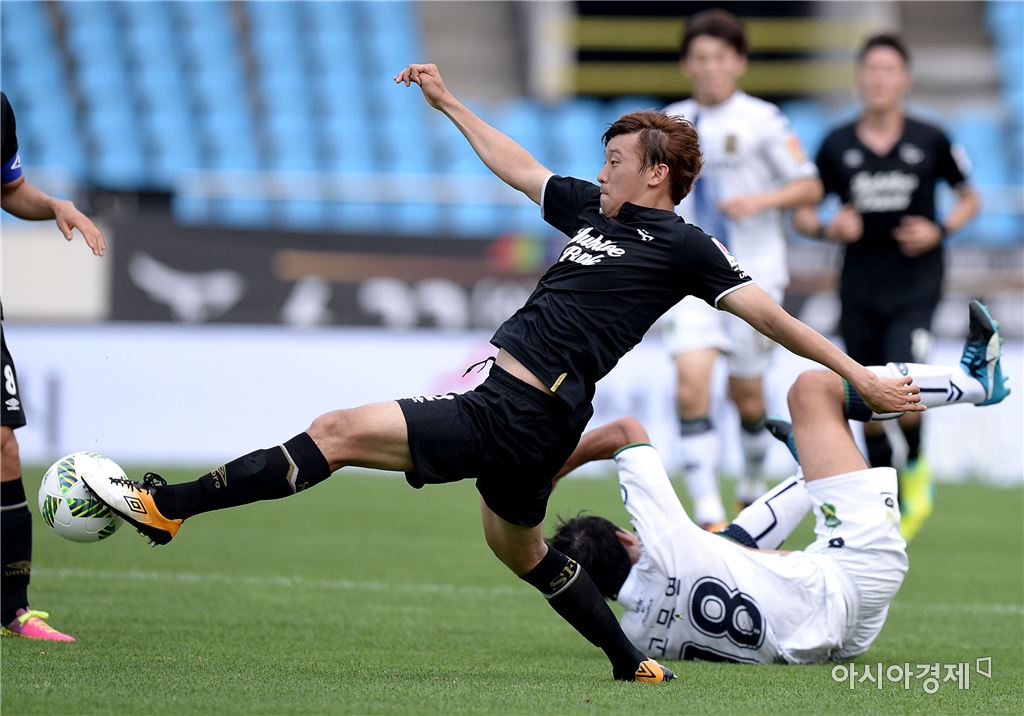 [성남=아시아경제 김현민 기자] 프로축구 성남 FC와 전북 현대의 2016 K리그 클래식 경기가 12일 성남 탄천종합운동장에서 열렸다. 성남 곽해성이 상대 고무열과 공을 다투고 있다. 김현민 기자 kimhyun81@asiae.co.kr<ⓒ세계를 보는 창 경제를 보는 눈, 아시아경제(www.asiae.co.kr) 무단전재 배포금지>