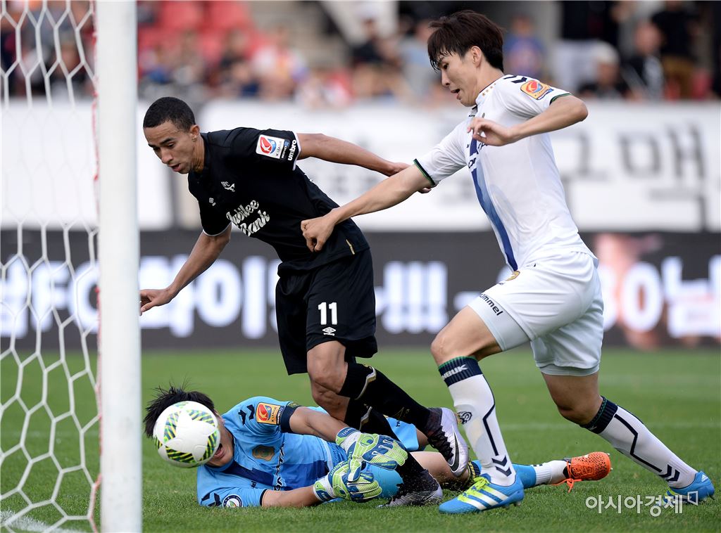 [성남=아시아경제 김현민 기자] 프로축구 성남 FC와 전북 현대의 2016 K리그 클래식 경기가 12일 성남 탄천종합운동장에서 열렸다. 성남 티아고가 후반 2-2 동점골을 성공시키고 있다. 김현민 기자 kimhyun81@asiae.co.kr<ⓒ세계를 보는 창 경제를 보는 눈, 아시아경제(www.asiae.co.kr) 무단전재 배포금지>