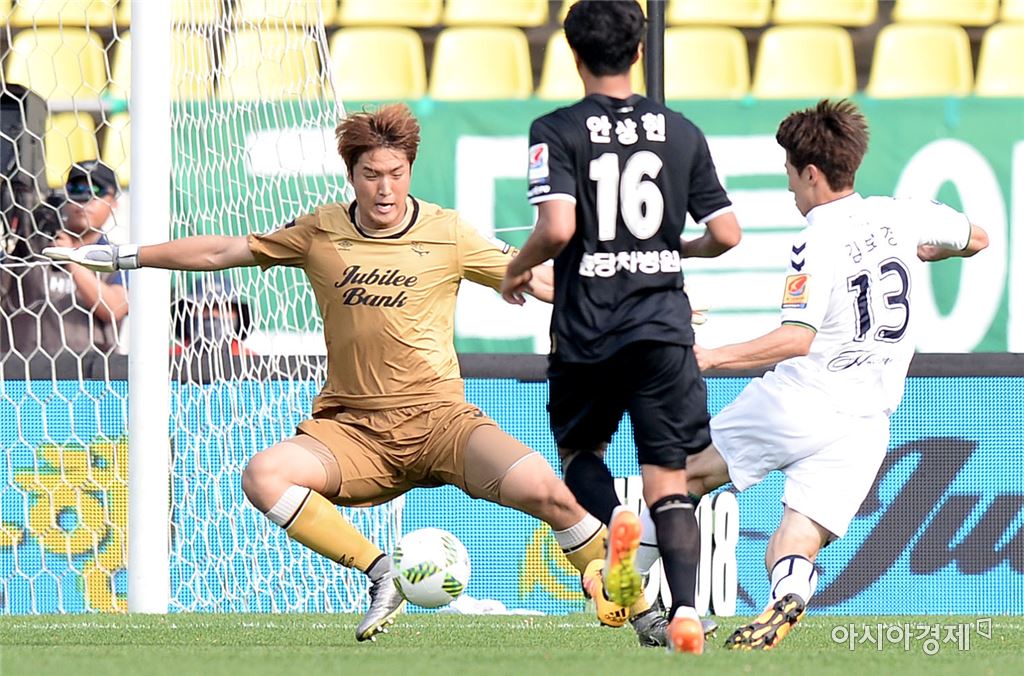 [성남=아시아경제 김현민 기자] 프로축구 성남 FC와 전북 현대의 2016 K리그 클래식 경기가 12일 성남 탄천종합운동장에서 열렸다. 성남 김동준 골키퍼가 상대 김보경의 슛을 막아내고 있다. 김현민 기자 kimhyun81@asiae.co.kr<ⓒ세계를 보는 창 경제를 보는 눈, 아시아경제(www.asiae.co.kr) 무단전재 배포금지>