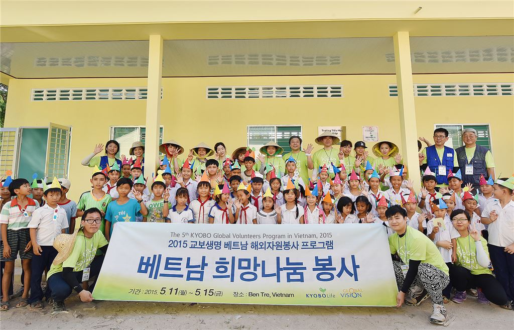 교보생명 임직원으로 구성된 '다솜이 글로벌 봉사단'이 지난해 베트남 낙후농촌지역에서 봉사활동을 펼친 뒤 기념 촬영을 하고 있다. (사진 : 교보생명)