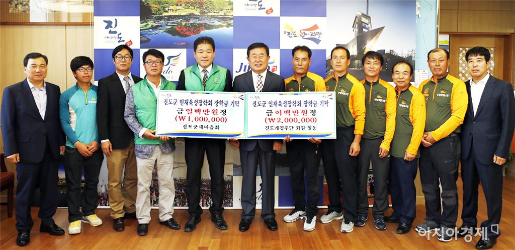 [아시아경제 노해섭 기자]진도군에서 활동하는 사회단체들이 잇달아 인재육성 장학금을 각각 기탁했다.진도군 새마을회 회원 일동은 진도 신비의 바닷길 축제 개최시 향토 음식점 운영의 수익금을 진도군 인재육성에 써달라며 장학금 100만원을 기탁했다. 이 단체는 지난해 4월에도 장학금 100만원을 기탁한 바 있다. 또 진도개 경주단 회원들이 진도군 인재육성에 써달라며 장학금 200만원을 기탁했다.장학금은 진도개 달리기 개최시 경주견 순위 맞히기 관광객 참여 수입금을 모아 기탁했으며, 작년 12월에도 140여만원을 기탁하기도 했다.(재)진도군인재육성장학회 관계자는 “기부자의 뜻에 맞게 열악한 환경 속에서도 좌절하지 않고 열심히 공부하는 우리지역 학생들을 위해 뜻깊게 사용할 계획이다” “앞으로도 기관사회단체 등 군민 여러분의 관심을 기대한다”고 말했다.노해섭 기자 nogary@<ⓒ세계를 보는 창 경제를 보는 눈, 아시아경제(www.asiae.co.kr) 무단전재 배포금지>