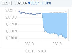 2016년 06월 13일 코스피 지수는 38.57p (1.91%) 하락한 1979.06로 마감했습니다.금일 (2시40분 기준) 코스피 주요 상승 종목은 세우글로벌,태림페이퍼,동부이며, 코스피 주요 하락 종목은 현대상선,해태제과식품,오리엔트바이오입니다.아경봇 기자 r2@asiae.co.kr<ⓒ세계를 보는 창 경제를 보는 눈, 아시아경제(www.asiae.co.kr) 무단전재 배포금지>