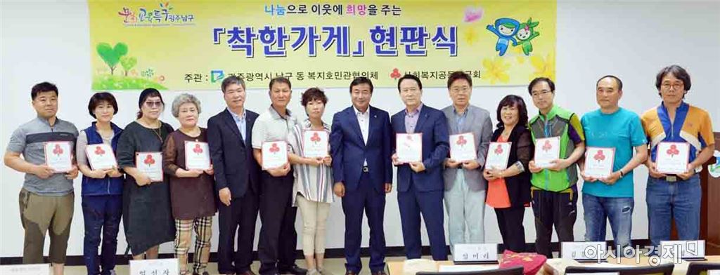 [아시아경제 노해섭 기자]광주 남구는 13일 봉선1동 일원에서 최영호 남구청장을 비롯한 동 복지호민관협의체 조형복 위원장, 광주사회복지공동모금회 김상균 사무처장 등이 참석한 가운데 나눔 문화 확산을 위한 ‘봉선1동 착한가게 현판식’을 개최했다. 사진제공=광주시 남구 <ⓒ세계를 보는 창 경제를 보는 눈, 아시아경제(www.asiae.co.kr) 무단전재 배포금지>