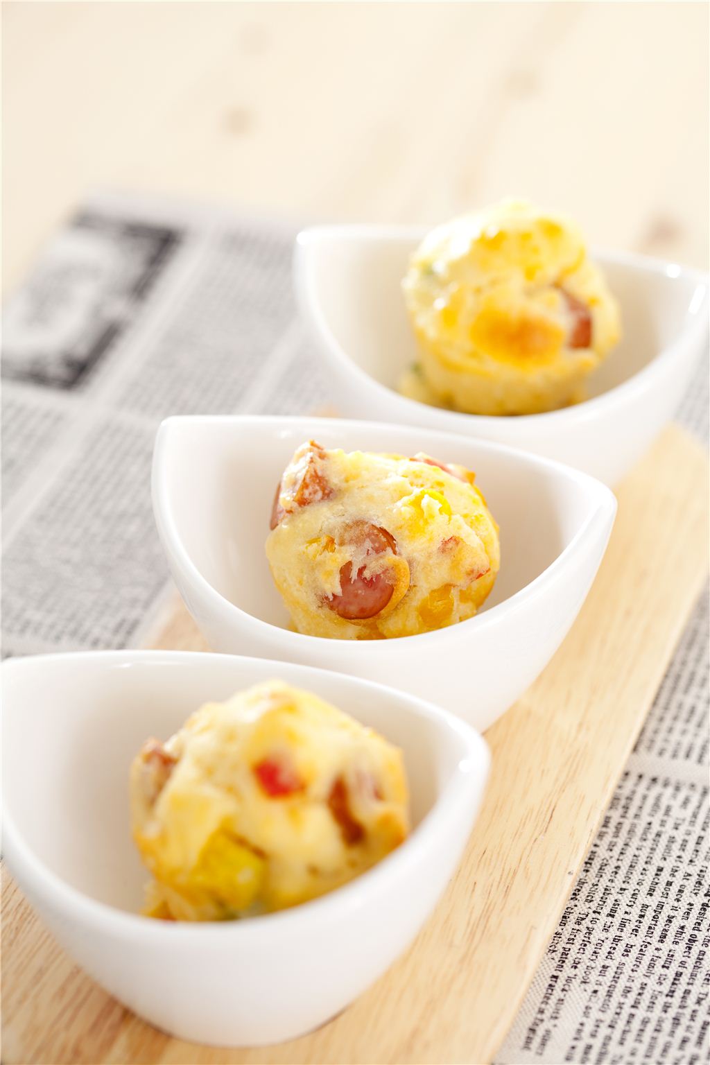 주키니 호박 50g, 양파 70g, 파프리카 50g, 옥수수(통조림) 30g, 햄 50g, 소금 적당량, 달걀 2개, 생크림 30g, 식용유 30g, 마요네즈 20g, 박력분 100g, 베이킹파우더 3g, 파마산 치즈가루 50g