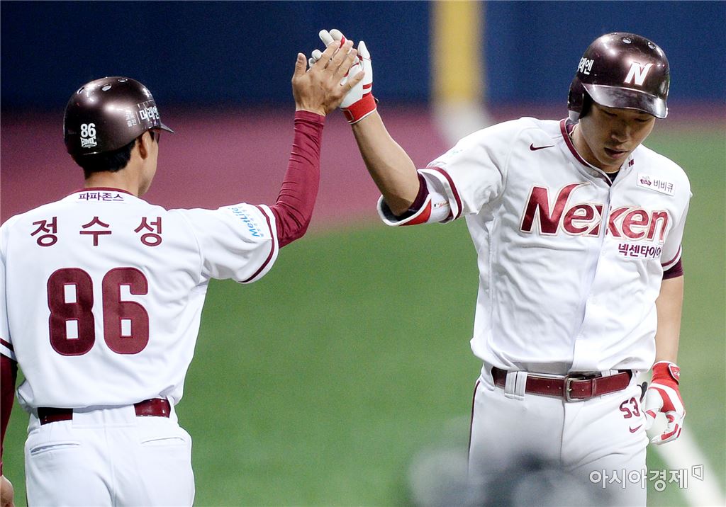 [고척돔=아시아경제 김현민 기자] 프로야구 롯데 자이언츠와 넥센 히어로즈의 2016 KBO리그 경기가 14일 서울 고척돔에서 열렸다. 1회말 1사에서 넥센 고종욱이 롯데 선발 박세웅을 상대로 우월 선제 솔로 홈런을 치고 정수성 코치와 하이파이브하고 있다. 김현민 기자 kimhyun81@asiae.co.kr<ⓒ세계를 보는 창 경제를 보는 눈, 아시아경제(www.asiae.co.kr) 무단전재 배포금지>