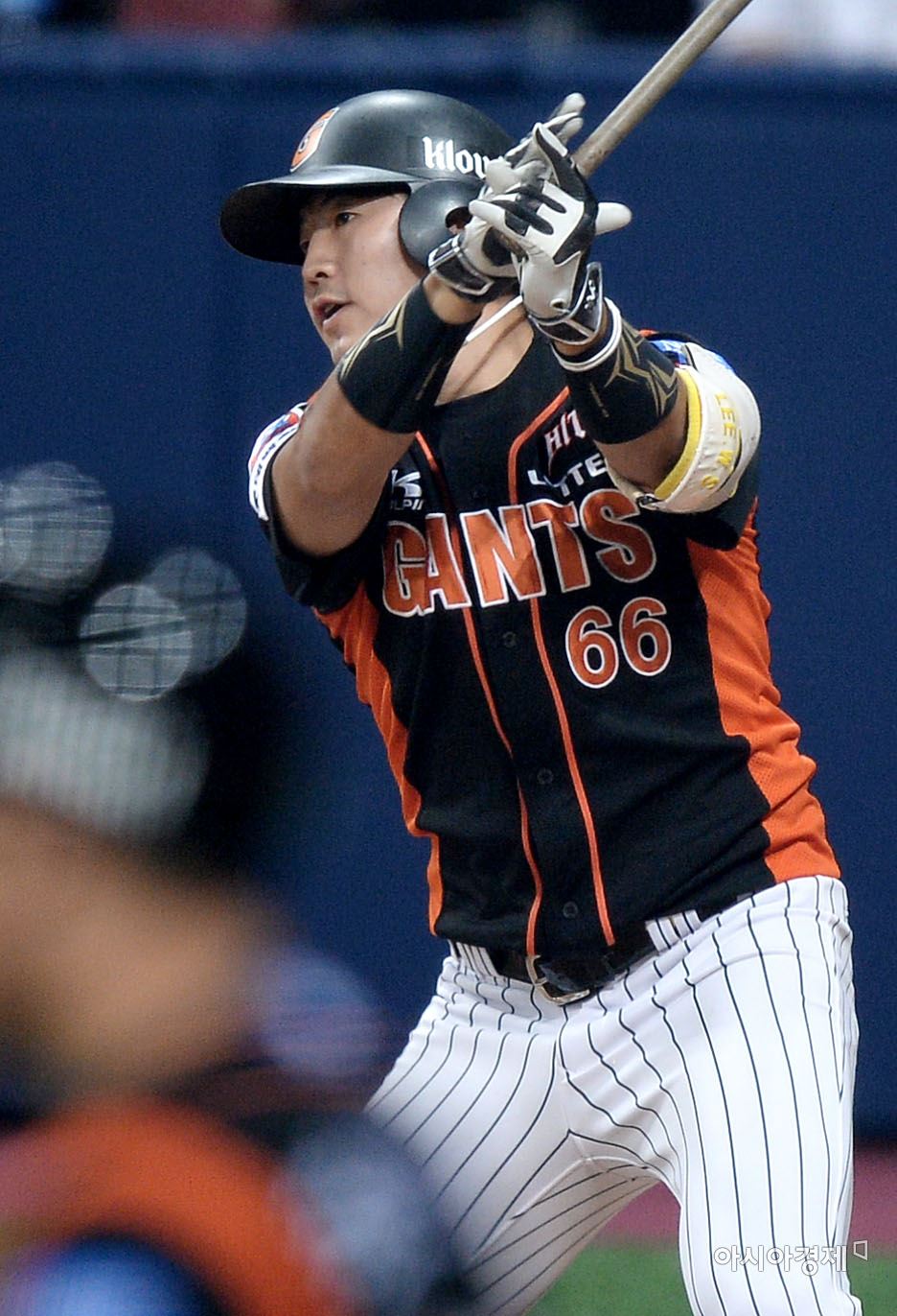 [고척돔=아시아경제 김현민 기자] 프로야구 롯데 자이언츠와 넥센 히어로즈의 2016 KBO리그 경기가 14일 서울 고척돔에서 열렸다. 4회초 2사 1,2루에서 롯데 김상호가 동점 1타점 적시타를 치고 있다. 김현민 기자 kimhyun81@asiae.co.kr<ⓒ세계를 보는 창 경제를 보는 눈, 아시아경제(www.asiae.co.kr) 무단전재 배포금지>