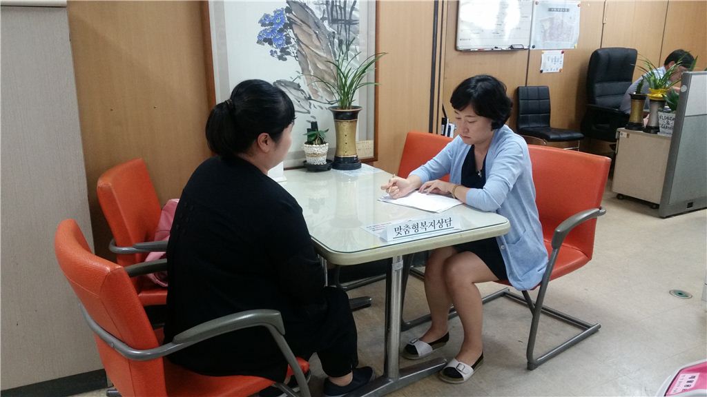 구리시가 읍면동 복지허브화 사업에 본격 나섰다. 동 주민센터 직원이 시민을 상대로 맞춤형 복지상담을 하고 있다.