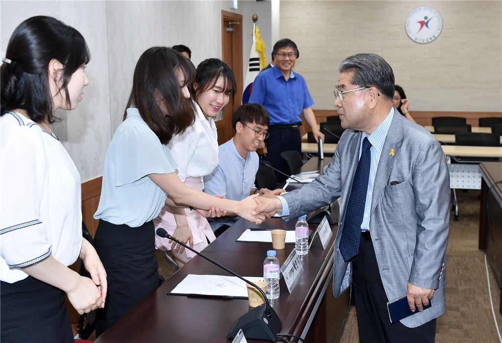 이재정 경기도교육감이 신규교사와의 간담회에 앞서 참석자들과 일일이 악수하고 있다.