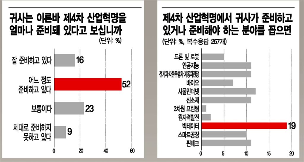 [아시아경제 김대섭 기자] 글로벌 경영환경의 미래가 불확실한 상황에서 '제4차 산업혁명' 시대에 발맞춰 미래경쟁력을 확보하기 위한 산업계의 준비는 미완인 것으로 나타났다. 이미 준비 중이거나 앞으로 준비해야 할 분야로는 '빅데이터'와 '사물인터넷(IoT)' '전기차ㆍ자율주행차' 등을 우선적으로 꼽았다. 제4차 산업혁명에 대응해 '잘 준비하고 있다'는 기업은 100곳 중 16곳, 16%에 불과했다. '어느 정도 준비하고 있다(52%)' '보통이다(23%)' '제대로 준비하지 못하고 있다(9%)' 순이었다. 제조업과 정보통신기술(ICT)을 융합한 차세대 산업혁명을 일컫는 제4차 산업혁명이 이미 곳곳에서 자리를 잡아가고 있지만 국내 기업들의 움직임은 아직 활발하지 못하다는 얘기다.<b/>◆'인공지능(AI)ㆍ빅데이터' 등이 변화 주도= 4차 산업혁명은 올해 1월 스위스 다보스에서 세계 40여개국 정상과 각계 리더들이 참석한 가운데 열린 '세계경제포럼'을 통해 화제가 되면서 부각됐다. 올해로 46주년을 맞이한 이번 포럼에서 창립 이래 최초로 '과학기술' 분야 주제를 주요 의제로 채택했는데 그것이 바로 4차 산업혁명이다. 이는 증기기관과 기계화로 대표되는 '제1차 산업혁명', 전기를 이용한 대량생산이 본격화된 '제2차 산업혁명', 컴퓨터 정보화와 자동화 생산시스템이 주도한 '제3차 산업혁명'에 이은 새로운 변화다. AI, IoT, 빅데이터 등이 주도하는 시대다. IoT 전문가인 이경전 경희대학교 교수는 "4차 산업혁명 시대에는 일하는 방식이 바뀌어야 기업이 살아남을 수 있다"며 "물리적 자원을 소유할 것인지, 생산할 것인지 또는 이를 네트워크로 연결해 플랫폼 비즈니스 모델을 만들어 나갈 것인지가 앞으로 기업 생존에 있어서 중요한 전략적 이슈가 될 것"이라고 말했다..