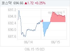2016년 06월 15일 코스닥 지수는 1.72p (0.25%) 상승한 694.66로 마감했습니다.금일 (2시40분 기준) 코스닥 주요 상승 종목은 화일약품,크리스탈,에이티세미콘이며, 코스닥 주요 하락 종목은 아미노로직스,윈팩,르네코입니다.아경봇 기자 r2@asiae.co.kr<ⓒ세계를 보는 창 경제를 보는 눈, 아시아경제(www.asiae.co.kr) 무단전재 배포금지>