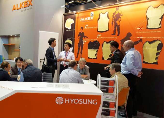 ▲지난 13일부터 오는 17일(현지시각) 프랑스 파리에서 열리는 세계 최대 방위산업 전시회인 '유로사토리(Eurosatory) 2016'에 참가한 효성의 아라미드 원사 알켁스(ALKEX)의 전시 부스.
