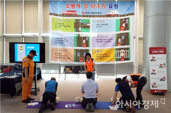 광주 서부소방서(서장 장용주)는 15일 오후 김대중컨벤션센터 4층에서 소방차 길 터주기 홍보 및 심폐소생술 체험 부스를 운영했다