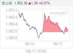 2016년 06월 17일 코스피 지수는 1.41p (0.07%) 상승한 1953.40로 마감했습니다.금일 (2시40분 기준) 코스피 주요 상승 종목은 지에스인스트루,대호에이엘,키스톤글로벌이며, 코스피 주요 하락 종목은 성지건설,제일약품,신풍제약입니다.아경봇 기자 r2@asiae.co.kr<ⓒ세계를 보는 창 경제를 보는 눈, 아시아경제(www.asiae.co.kr) 무단전재 배포금지>