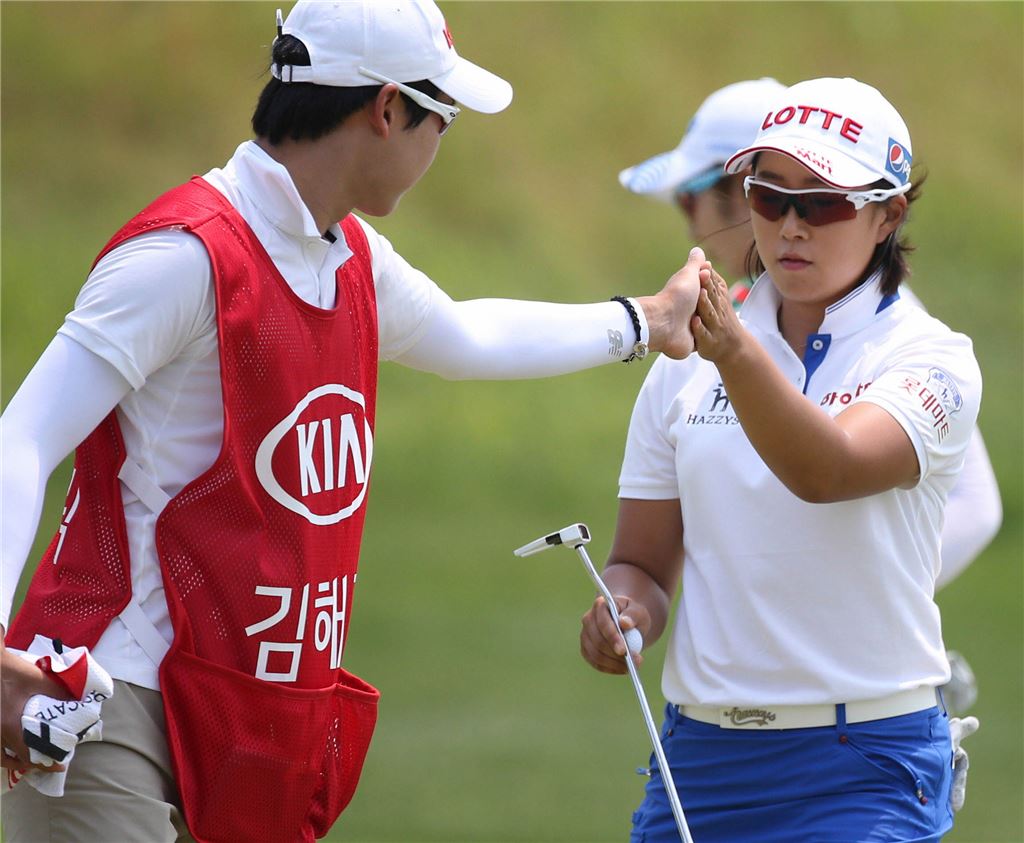 김해림(오른쪽)이 한국여자오픈 둘째날 3번홀에서 파 퍼팅을 성공시킨 뒤 캐디와 하이파이브를 하고 있다. 사진=KLPGA