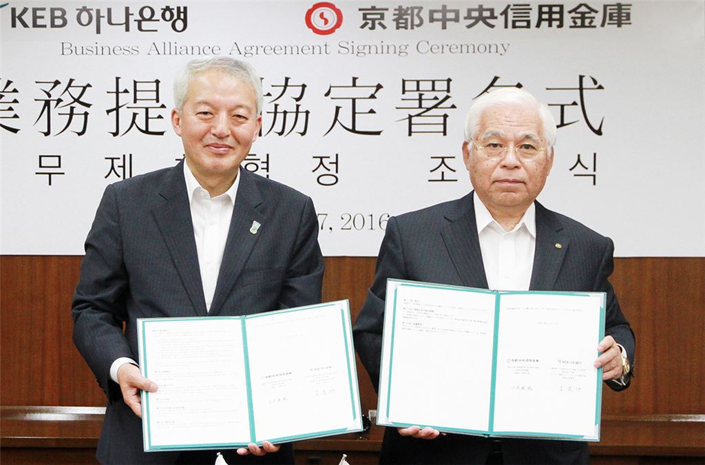 KEB하나은행은 17일 일본 교토에 소재한 교토중앙신용금고 본점에서 업무 협약식을 갖고, 일본에서 한국으로의 해외송금 및 한국에 진출한 일본 기업 지원 등을 위한 업무를 제휴키로 했다. 강용득 KEB하나은행 글로벌영업1본부장(사진 왼쪽)과 시라하세 마코토 교토중앙신용금고 이사장(사진 오른쪽)이 협약서에 서명 후 기념촬영을 하고 있다. (사진제공=KEB하나은행)