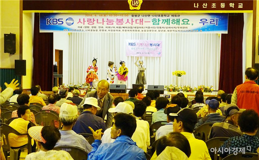 함평군 나산면 나산초등학교에서 18일 KBS광주사랑나눔봉사대(대장 강정기 KBS광주방송총국장)가 주민들을 대상으로 봉사활동을 펼쳤다.<br />