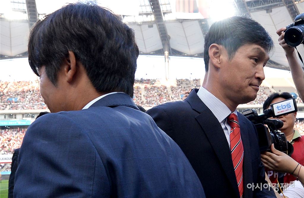[상암=아시아경제 김현민 기자] 프로축구 FC 서울과 수원 삼성의 2016 K리그 클래식 경기가 18일 서울월드컵경기장장에서 열렸다. 경기에 앞서 서울 최용수 감독과 수원 서정원 감독이 인사를 나눈 뒤 돌아서고 있다. 김현민 기자 kimhyun81@asiae.co.kr<ⓒ세계를 보는 창 경제를 보는 눈, 아시아경제(www.asiae.co.kr) 무단전재 배포금지>
