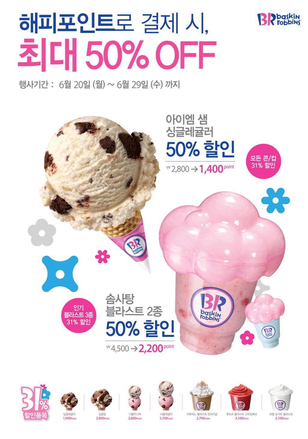 20일부터 29일까지 아이스크림과 블라스트 구입 시, 전액 해피포인트로 결제하면 31% 특별가 혜택 제공[아시아경제 오주연 기자]배스킨라빈스는 20일부터 29일까지 열흘간‘해피포인트 페스티벌’을 실시한다고 밝혔다. 해피포인트 페스티벌은 싱글 레귤러를 포함한 4가지 사이즈 아이스크림과 5종의 블라스트 음료 구입 시 구입가 전액을 해피포인트로 결제하면 최대 50% 할인혜택을 제공하는 행사다. 6월 이달의 아이스크림인 ‘아이엠 샘’ 싱글 레귤러 사이즈와 이상한 나라의 솜사탕 블라스트, 아이스 베리 솜사탕 블라스트를 해피포인트로 결제하면 50% 혜택가인 1400원, 2200원에 구입할 수 있다.이 외 제품들은 배스킨라빈스 31주년을 맞아 31% 할인 특별가에 제공된다. 싱글 레귤러, 싱글킹, 더블 주니어, 더블 레귤러는 1900원, 2400원, 2600원, 3700원에 판매된다. 오리지널 카푸치노 블라스트는 2700원, 스트로베리 후르츠 블라스트와 리얼 요거트 블라스트는 3100원이다. (음료 5종 레귤러 사이즈 기준)이번 행사는 보유한 해피포인트 금액 내에서 참여할 수 있으며 타 행사, 타 쿠폰, 제휴행사 중복 적용 및 해피포인트 적립은 불가능하다. (일부점포 제외)오주연 기자 moon170@asiae.co.kr<ⓒ세계를 보는 창 경제를 보는 눈, 아시아경제(www.asiae.co.kr) 무단전재 배포금지>