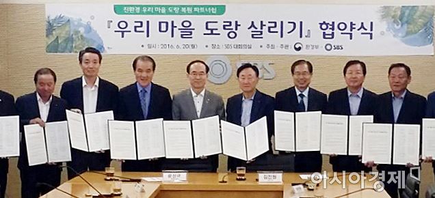 [아시아경제 노해섭 기자]송광운 광주시 북구청장은 20일 서울 SBS 목동 사옥 대회의실에서 열린 환경부 주관 우리마을 도랑살리기 협약식에 참석해 윤성규 환경부 장관과 협약서를 들고 기념촬영을 하고 있다. 이번 친환경 우리마을 도랑 살리기 협약식은 하수 기능으로 천락한 도랑에 생명력을 부여하고, 생태적으로 건강하고 자연이 살아있는 청장마을을 만들기 위해 신규지자체 22곳이 참여했다.사진제공=광주시 북구<ⓒ세계를 보는 창 경제를 보는 눈, 아시아경제(www.asiae.co.kr) 무단전재 배포금지>