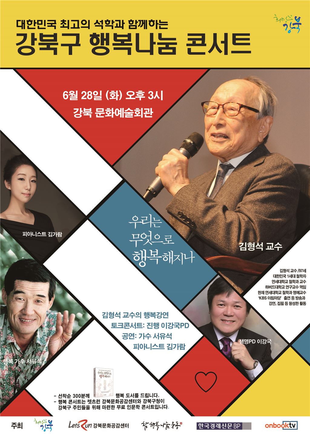 김 교수는 이번 강연에서 ‘예수’, ‘고독이라는 병’, ‘어떻게 믿을 것인가’, ‘우리는 무엇으로 행복해지나’ 등 그의 저서를 통해 대중들에게 전달해 온 보편적 삶에 대한 성찰과 교훈 그리고 철학적 관점에서 본 행복의 본질에 대해 이야기하려고 한다. 강연은 ‘생명다큐 PD’라 불리는 이강국 PD가 진행하며 인문학 강연 외에도 피아니스트 김가람의 오프닝 공연, 가수 서유석의 노래공연 등 다양한 문화공연으로 채워질 예정이다. 참가 희망자는 별도 사전 신청 없이 당일 현장 방문해 입장하면 된다. 선착순 300명에게는 김형석 교수의 저서인 ‘우리는 무엇으로 행복해지나’를 무료 증정하는 이벤트도 준비돼 있다. 박겸수 강북구청장은 “이번 강연이 일상 속에 녹아있는 행복을 발견하고 삶의 활력을 충전하는 계기가 되길 바란다. 앞으로도 구민들의 욕구를 적극 반영해 다양한 분야의 수준 높은 인문학 프로그램을 운영해 나가도록 하겠다.”고 말했다. 강북구 교육지원과(☎901-6304)박종일 기자 dream@asiae.co.kr<ⓒ세계를 보는 창 경제를 보는 눈, 아시아경제(www.asiae.co.kr) 무단전재 배포금지>
