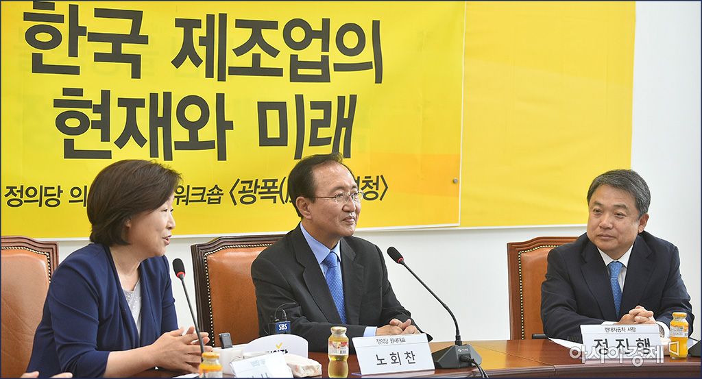 [아시아경제 윤동주 기자] 심상정 정의당 대표와 노회찬 원내대표 등 정의당 의원들이 21일 서울 여의도 국회에서 정진행 현대차 사장과 '한국 제조업의 현재와 미래'라는 주제로 토론을 벌이고 있다.윤동주 기자 doso7@asiae.co.kr<ⓒ세계를 보는 창 경제를 보는 눈, 아시아경제(www.asiae.co.kr) 무단전재 배포금지>
