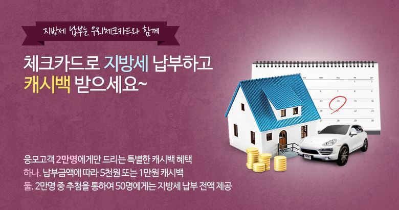 [아시아경제 정현진 기자] 우리카드가 우리 체크카드로 지방세나 학원비를 납부하는 고객을 대상으로 캐시백을 제공하는 이벤트를 진행한다고 21일 밝혔다.우리카드는 다음달 31일까지 자동차세, 재산세, 지방소득세, 주민세, 취·등록세 등 모든 지방세에 대해 우리 체크카드로 납부하면 최대 1만원의 캐시백을 제공한다. 이벤트 기간 중 우리카드 홈페이지나 모바일앱에서 이벤트에 응모한 후 10만원 이상 납부하면 5000원, 30만원 이상 납부하면 1만원 캐시백을 받을 수 있다. 선착순 2만명에게 제공하며 고객당 1회 받을 수 있다. 여기에 위 조건을 충족한 2만명의 고객 중 50명에게 추첨을 통해 최대 10만원까지 납부금액의 100%를 추가로 특별 캐시백을 준다.또 학원비 캐시백 이벤트도 진행한다. 다음달 16일까지 우리카드 홈페이지나 모바일앱을 통해 응모하고 우리체크카드로 학원비를 결제하면 누적된 결제금액에 따라 최대 5만원의 캐시백을 받을 수 있다. 정현진 기자 jhj48@asiae.co.kr<ⓒ세계를 보는 창 경제를 보는 눈, 아시아경제(www.asiae.co.kr) 무단전재 배포금지>정현진 기자 jhj48@asiae.co.kr<ⓒ아시아 대표 석간 '아시아경제' (www.newsva.co.kr) 무단전재 배포금지>